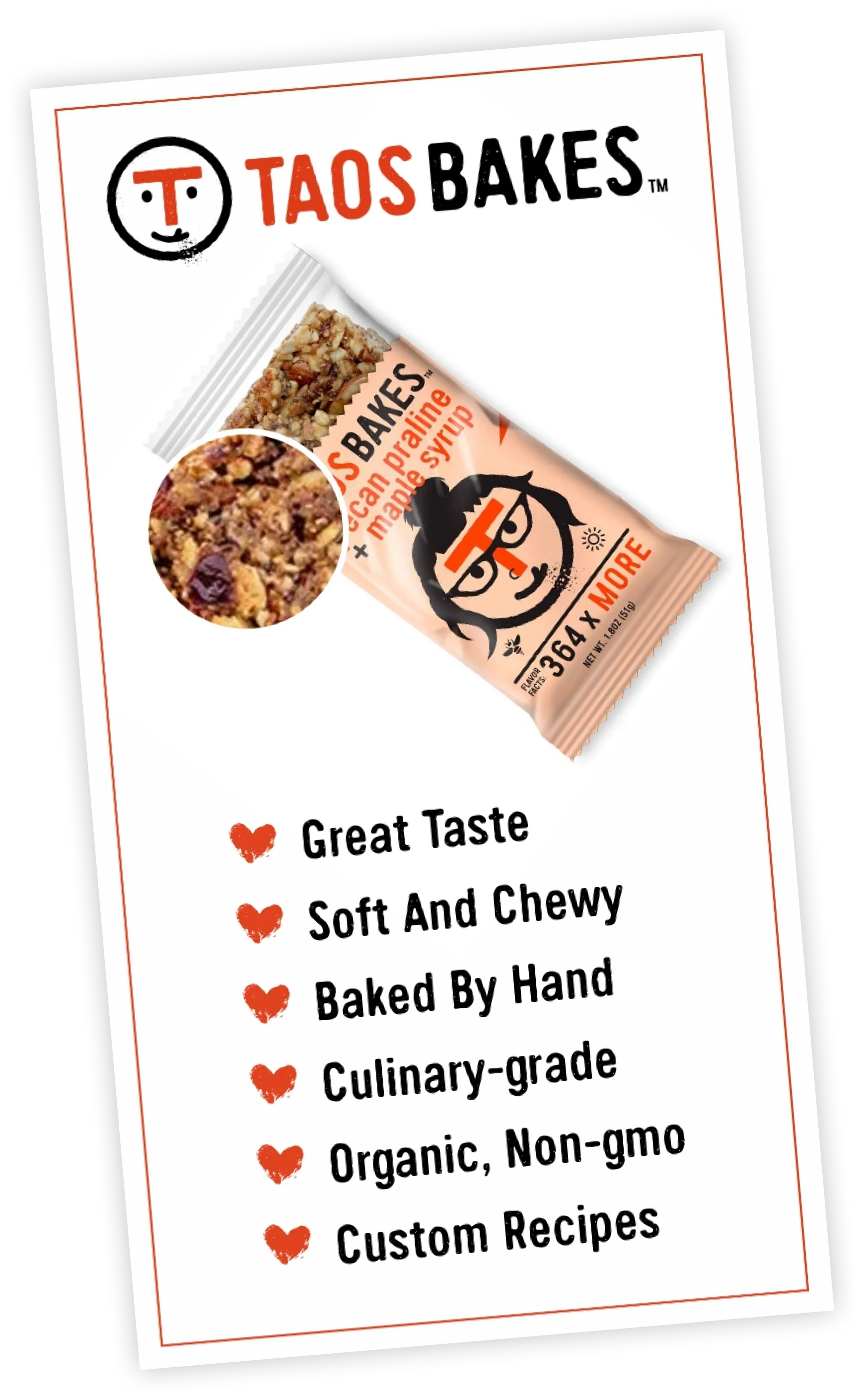 That’s where Taos Bakes comes in. We’re obsessed with great taste, the kind that you can see, smell, and feel. Our snacks (not to be confused with those lumpy cardboard-tasting bars you may have run into) live at the intersection of people, process, and food.