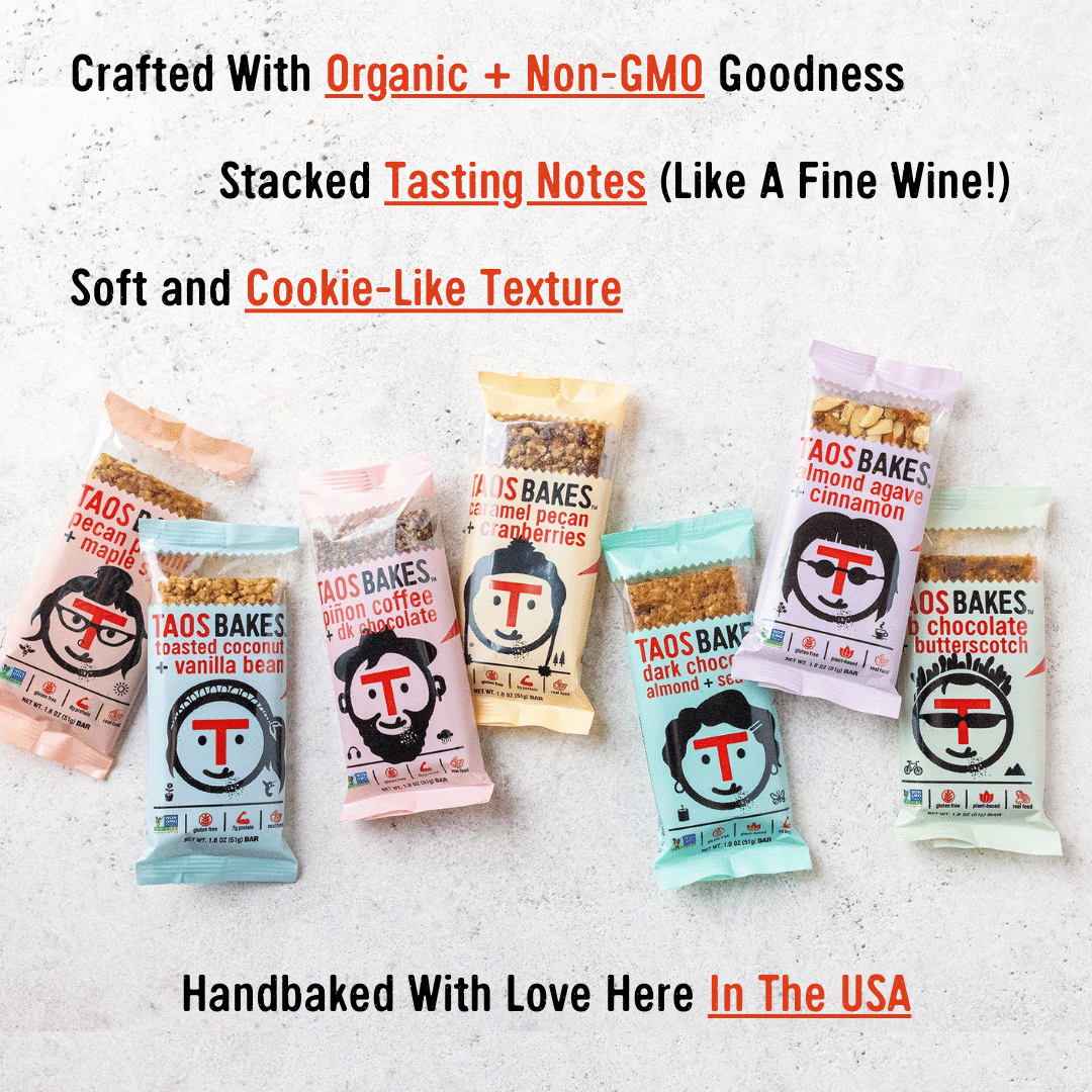 That’s where Taos Bakes comes in. We’re obsessed with great taste, the kind that you can see, smell, and feel. Our snacks (not to be confused with those lumpy cardboard-tasting bars you may have run into) live at the intersection of people, process, and food.