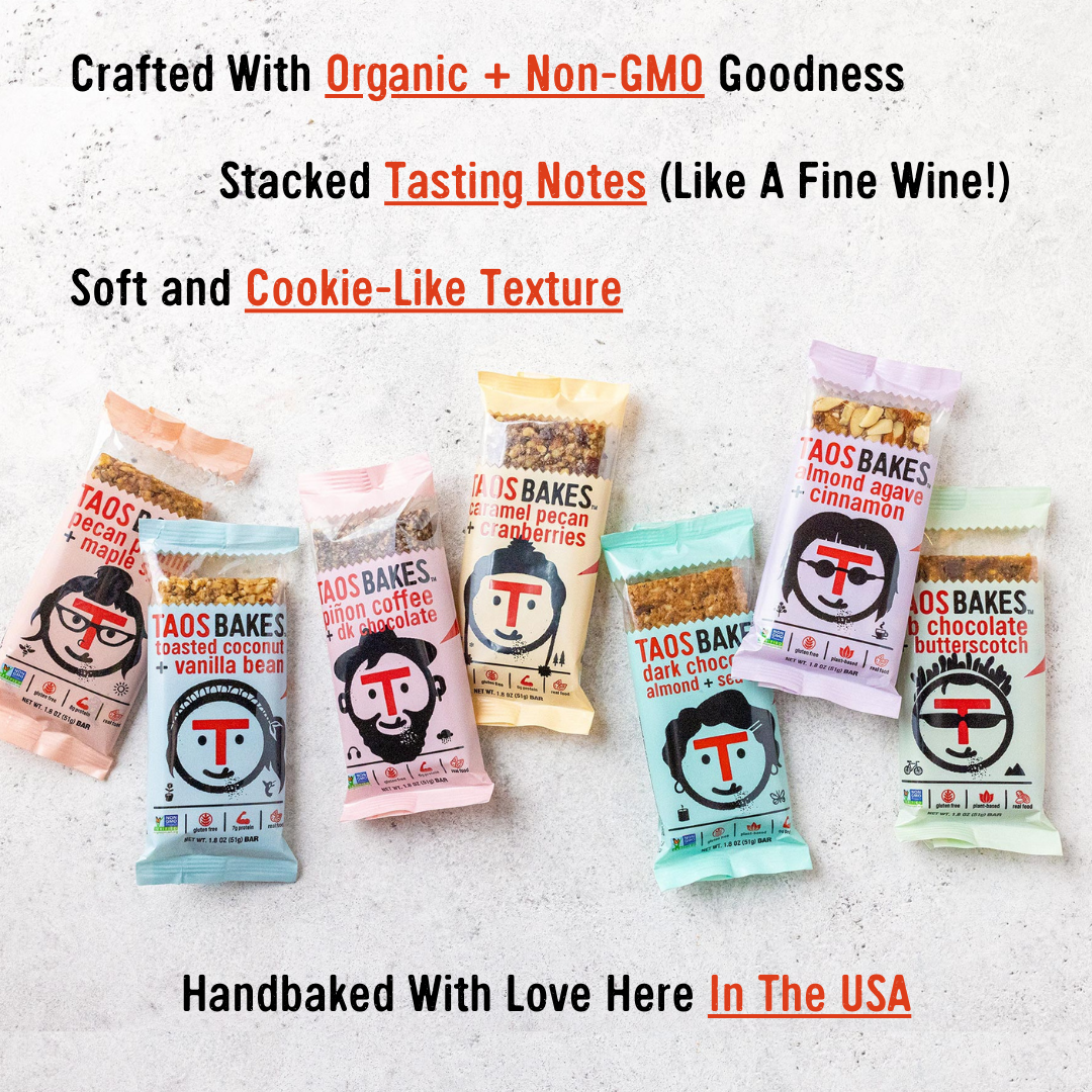 That’s where Taos Bakes comes in. We’re obsessed with great taste, the kind that you can see, smell, and feel. Our snacks (not to be confused with those lumpy cardboard-tasting bars you may have run into) live at the intersection of people, process, and food.